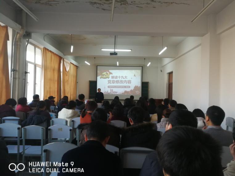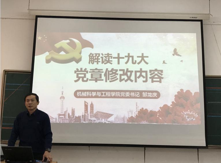 ,美高梅官网党委书记邹龙庆同志在机电馆509给全院教工党员做了“解读十九大对《中国共产党章程》内容修改”的专题讲座,有74名教工党员聆听了本次讲座。