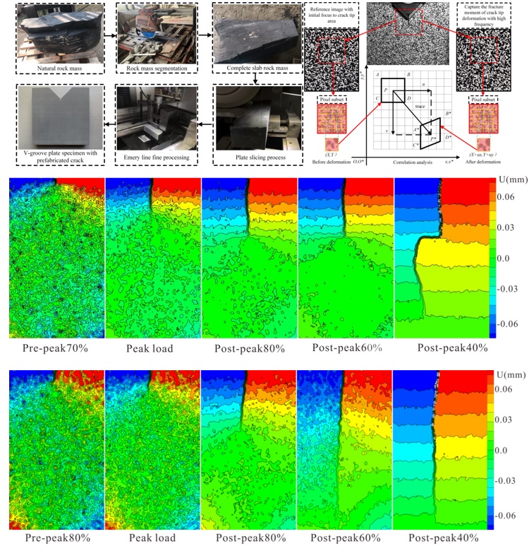 原位温压耦合环境下对岩石断裂行为进行可视化测试一直是困扰深部储层岩石断裂力学研究的难题。本文创新性地设计搭建了原位温压耦合条件下岩石断裂可视化实验系统,开展不同温度、围压耦合条件的断裂实验。采用数字图像相关技术对裂尖断裂过程区的演化发育过程进行实时捕捉,分析温度和围压对岩石断裂性质的影响规律,为研究深部储层岩石断裂行为提供可行方法。原位温压耦合条件下,页岩塑性增强导致裂尖钝化,峰后软化关系趋于非线性的“上凸”趋势,呈现韧性增强的非线性断裂特征。通过建立断裂本构模型有效地表征深部储层非线性断裂行为。为深部储层压裂改造研究提供基础。